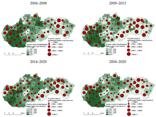 Growing of perennial forages in districts of the Slovak Republic in the years 2004–2008, 2009–2013, 2014–2020, and 2004–2020. Source: [18].