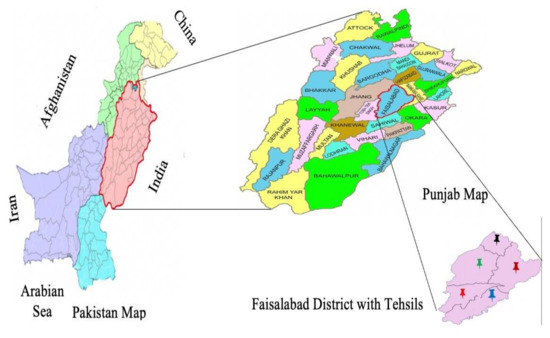 Faisalabad is the third-largest city in Pakistan, and more than 50% of its population lives in rural areas. The district has fertile agricultural land, helping to improve the FNS not only in the Punjab province but also in the country [19]. Therefore, Faisalabad was selected as the study area for this research (Figure 1).
