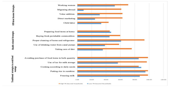 Although child labor is prohibited in Pakistan, child labor is still a common strategy to fulfill the daily food needs of households. Health and nutrition are linked to each other. Rural households adopt different strategies such as buying perishable food commodities on an as-needed basis, cooking at home, drinking clean water from canals, and maintaining a careful diet for elders to maintain health. The majority of the traditional strategies considered in this study is local and may vary by region and country. Traditional strategies decrease food waste and also assist in saving income for rural households. All off-farm strategies have the potential to directly or indirectly influence the FNS of rural households either through increasing income or avoiding food waste.