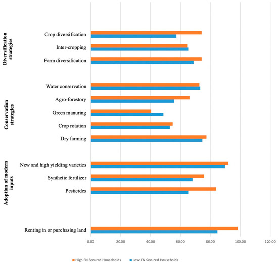 Figure 4 depicts the farm-level strategies adopted by the low and high FNS groups. The figure shows that 98% of the rural households belonging to the high FNS group opted to grow their farm business by purchasing or renting more farmland compared with 84% of the rural households in the low FNS group. The proportion of rural households that adopted water conservation practices was almost the same in both FNS groups. Moreover, the use of synthetic fertilizers was higher among the high FNS group as compared to the low FNS group. Similarly, the adoption of crop diversification is more conspicuous among the high FNS group (around 75% respondents in this category) compared with 57% respondents in the low FNS group. As evident from Figure 4, the frequency of strategy adoption is generally higher for high FNS households than low FNS households.