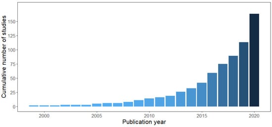 Figure 1. Exponential increase in time of published studies used in our overview (the bar left of 2000 refers to all studies before the year 2000). In total 163 unique studies (peer-reviewed publications) were used: 154 meta-analysis studies and 9 reviews.