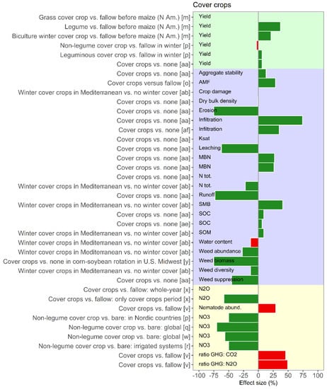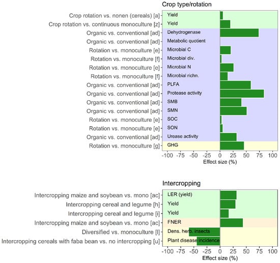 Figure 2. Overall effect sizes (response ratios) reported in meta-analysis studies on cropping (split in crop types and crop rotation, cover crops, intercropping, and perennial crops) grouped per area of interest (light green: agronomic; light blue: soil quality; light orange: resource use efficiency; light brown: economic (no data); light yellow: environmental impacts). The management or treatment comparison is indicated outside the y-axis and the variable to which the data refer are listed inside the y-axis (abbreviations can be found in Table A1). Green bars indicate improvement, red bars indicate worsening. See also Table S1. [a]: [24]; [b]: [28]; [c]: [27]; [d]: [40]; [e]: [41]; [f]: [42]; [g]: [38]; [h]: [43]; [i]: [44]; [j]: [30]; [k]: [45]; [l]: [46]; [m]: [47]; [n]: [48]; [o]: [49]; [p]: [32]; [q]: [31]; [r]: [50]; [s]: [51]; [t]: [52]; [u]: [33]; [v]: [53]; [w]: [54]; [x]: [39]; [y]: [55]; [z]: [56]; [aa]: [57]; [ab]: [58]; [ac]: [59]; [ad]: [60]; [ae]: [61]; [af]: [62].