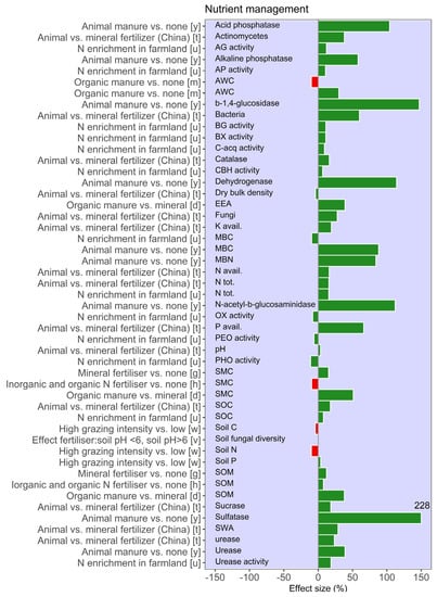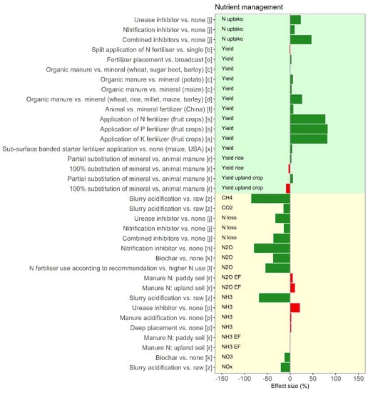 Figure 3. Overall response ratios reported in meta-analysis studies on nutrient management grouped per area of interest (light green: agronomic; light blue: soil quality; light orange: resource use efficiency (no data); light brown: economic (no data); light yellow: environmental impacts). The management or treatment comparison is indicated outside the y-axis and the variable to which the data refer are listed inside the y-axis (abbreviations can be found in Table A1). Green bars indicate improvement, red bars indicate worsening. See also Table S2. [a]: [63]; [b]: [64]; [c]: [65]; [d]: [66]; [e]: [67]; [f]: [68]; [g]: [69]; [i]: [70]; [j]: [71]; [k]: [72]; [l]: [39]; [m]: [73]; [n]: [74]; [o]: [75]; [p]: [76]; [q]: [77]; [r]: [78]; [s]: [79]; [t]: [80]; [u]: [81]; [v]: [82]; [w]: [83]; [x]: [84]; [y]: [85]; [z]: [86].