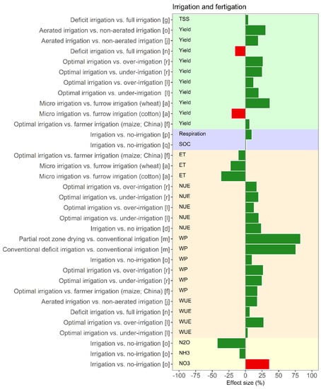 Figure 4. Overall response ratios reported in meta-analysis studies on irrigation and fertigation grouped per area of interest (light green: agronomic; light blue: soil quality; light orange: resource use efficiency; light brown: economic (no data); light yellow: environmental impacts). The management or treatment comparison is indicated outside the y-axis and the variable to which the data refer are listed inside the y-axis (abbreviations can be found in Table A1). Green bars indicate improvement, red bars indicate worsening. See also Table S3. [a]: [94]; [b]: [90]; [c]: [95]; [d]: [96]; [e]: [91]; [f]: [97]; [g]: [98]; [h]: [99]; [i]: [89]; [j]: [100]; [k]: [101]; [l]: [88]; [m]: [102]; [n]: [103]; [o]: [104]; [p]: [92]; [q]: [93]; [r]: [70].