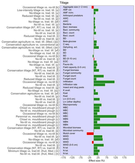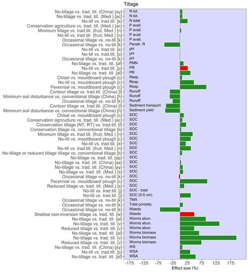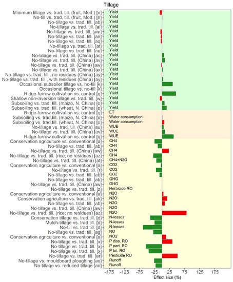 Figure 5. Overall response ratios reported in meta-analysis studies on tillage grouped per area of interest (light green: agronomic; light blue: soil quality; light orange: resource use efficiency; light brown: economic (no data); light yellow: environmental impacts). The management or treatment comparison is indicated outside the y-axis and the variable to which the data refer are listed inside the y-axis (abbreviations can be found in Table A1). Green bars indicate improvement, red bars indicate worsening. See also Table S5. [a]: [112]; [b]: [61]; [c]: [123]; [d]: [123]; [e]: [124]; [f]: [125]; [g]: [124]; [h]: [120]; [i]: [115]; [j]: [118]; [k]: [119]; [l]: [126]; [m]: [127]; [n]: [63]; [o]: [128]; [p]: [129]; [q]: [130]; [r]: [131]; [s]: [132]; [t]: [133]; [u]: [49]; [v]: [114]; [w]: [134]; [x]: [53]; [y]: [135]; [z]: [122]; [aa]: [136]; [ab]: [137]; [ac]: [138]; [ad]: [139]; [ae]: [140]; [af]: [117]; [ag]: [74]; [ah]: [141]; [ai]: [142]; [aj]: [113]; [ak]: [143]; [al]: [116]; [am]: [111]; [an]: [22]; [ao]: [121]; [ap]: [144]; [aq]: [24]; [ar]: [145]; [as]: [146]; [at]: [147]; [au]: [148]; [av]: [149]; [aw]: [150]; [ax]: [151]; [ay]: [152]; [az]: [153].