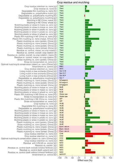 In most cases, crop residue management and mulching increased crop yields, and water and nitrogen use efficiencies by 0 to 50% (Figure 6). Mulching greatly reduced soil evaporation and thereby provided a greater fraction of soil water to the crop, which boosted crop yields. Crop residue return has a positive effect on soil carbon sequestration and soil microbial activity, but N2O emissions increased as well. Nine out of the 19 meta-analysis studies dealt with soil mulching effects in China, as it is a common practice in dry-land farming in China (and India). One study examined the performance of biodegradable plastics to determine the optimal type of mulching for maize, wheat, potato, and cotton [172], and another [173] compared the performance of biodegradable films relative to polyethylene films.