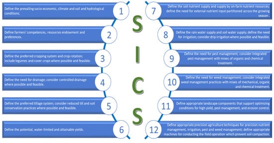 Figure 7. Towards sustainable cropping systems; a step-wise roadmap for developing high-yielding, soil-improving and environmentally sound cropping systems. The steps (1 to 12) have to be taken in a consecutive-iterative manner so as to find the optimal combination of practices.
