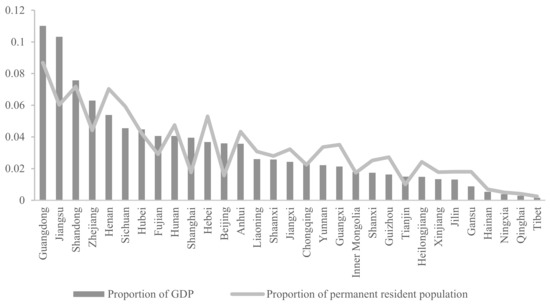 The proportion of GDP and permanent resident population in 2017 in Chinese provinces (data source: National Bureau of Statistics of China).