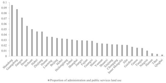 According to the ratio of the permanent population of each province to the nationwide population at the end of 2017 and the proportion of each province’s GDP as part of the national GDP (Figure 1), the per capita GDP of each province in China is not balanced, which will cause the population to move to provinces with higher GDP to earn a higher income. On the other hand, provinces with better economic growth will place greater pressure on the migrant population, and the requirements for the supply of public infrastructure and affordable housing in such provinces will be higher. More developed provinces are constantly attracting migrant workers, suggesting that such provinces need more affordable housing construction to stabilize the sizable settlement requirement of the inflowing migrant population to ensure that China’s population urbanization can proceed with high quality. From the data on the proportion of administration and public services land (Figure 2), we find that there is a certain spatial mismatch between China’s population urbanization and basic public services, which is the core research focus of this article.