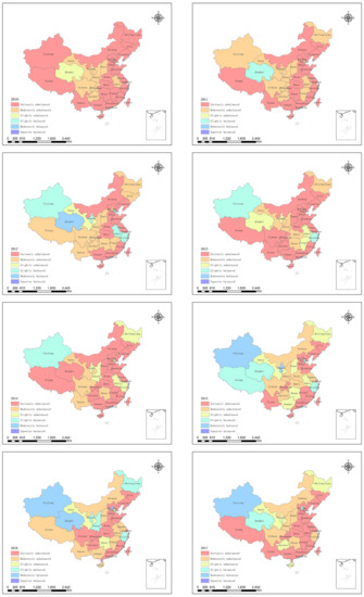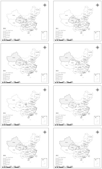Low–low agglomeration provinces are primarily concentrated in the eastern coastal areas, such as Guangdong Province, but the characteristics of such low–low agglomeration will not be evident by 2017. The eastern provinces have developed economies and industries, and many migrants flow into urban areas. The urbanization level of the population was high. However, local governments in this area are under tremendous pressure to implement affordable housing; thus, the increased security level cannot keep up with the population urbanization rate. However, in recent years, local governments have increased their investment in affordable housing to achieve “housing to live” and curb the rapid rise in housing prices, and affordable housing has, thus, improved. Therefore, the low–low agglomeration characteristics in this type of area became insignificant.
