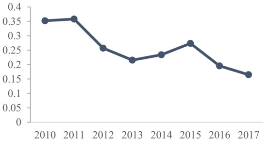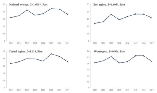 Change trend and test of coupling coordination degree from 2010 to 2017. (Notes: “*” indicates that it has passed the 90% confidence tests.)
