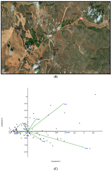 (A) The study area from which samples were taken is located in Beit Jibrin; (B) the study area and where the samples were selected by satellite; (C) the principal component analysis; and (D) detrended correspondence analysis.