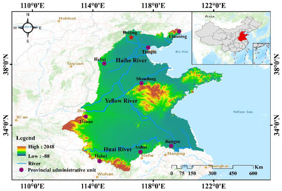 The Huang-Huai-Hai River Basin is located in the eastern coastal area of China (111°9′ N–122°7′ N, 30°9′ E–40°4′ E). As shown in Figure 1, the Huang-Huai-Hai River Basin flows through seven provinces, including Liaoning, Hebei, Shandong, Henan, Jiangsu, Anhui and Hubei, as well as Beijing and Tianjin municipalities directly under the Central Government. The Huang-Huai-Hai River Basin consists of Haihe River, Huaihe River, the lower reaches of the Yellow River and their tributaries, and it is also an important grain producing area in China. The Huang-Huai-Hai River Basin covers an area of about 5.6 × 105 km2, with arable land accounting for about 70% of the total area, of which dry land accounts for about 65% and water field for about 4%. Construction land is the second largest type of land use in this area, accounting for about 14% of the total area, and it is increasing continuously [26,27].