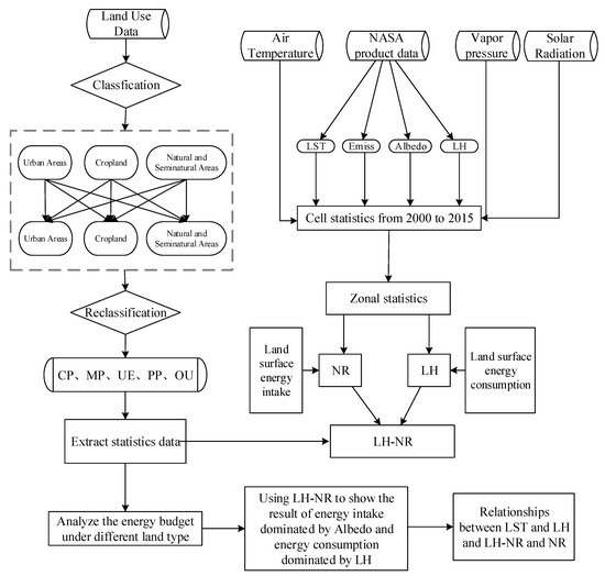 The land cover data from ESA with 300 m spatial resolution were used, and the download ad-dress is (http://maps.elie.ucl.ac.be/CCI/viewer/download.php, accessed on 20 May 2021). Solar radiation data is obtained from BESS short-wave radiation products released from the Korean Seoul National University Environmental Ecological Lab. (http://environment.snu.ac.kr, accessed on 20 May 2021). The remote sensing data for albedo, LST, land surface emissivity and LE are all from MODIS data products, provided by NASA, from 2000 to 2015 (https://modis.gsfc.nasa.gov, accessed on 20 May 2021). Temperature interpolation data were obtained from the Resource and Environmental Science Data Centre of the Chinese Academy of Science (http://www.resdc.cn, accessed on 20 May 2021), data link is https://www.resdc.cn/data.aspx?DATAID=228. Water vapor pressure data were obtained from the European Centre for Medium-Range Weather Fore-casts (https://climate.copernicus.eu/, accessed on 20 May 2021).