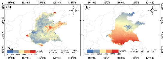 Spatial differences of (a) net shortwave radiation () and (b) net long-wave radiation () in the Huang-Huai-Hai River Basin from 2000 to 2015.