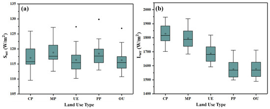 Statistical values of (a) net shortwave radiation () and (b) net long-wave radiation ( ) based on five land types in the Huang-Huai-Hai River Basin from 2000 to 2015.