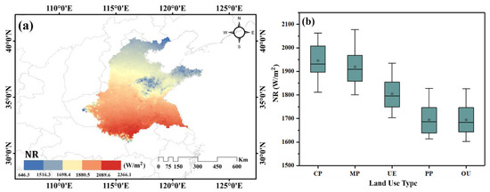(a) Spatial variation in net radiation (NR) in the Huang-Huai-Hai River Basin for 2000–2015 and (b) statistical values for the five use types.