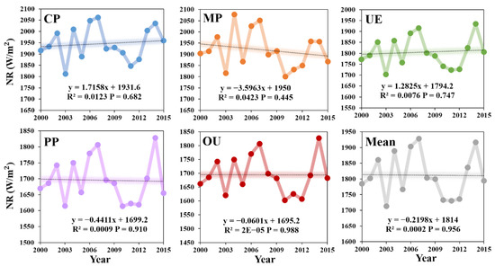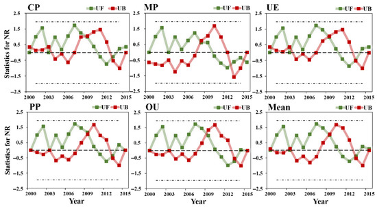 The variation trend of NR of different land use types showed that there were significant differences among the five land use types (Figure 7). The multi-year averages of CP and MP regions of NR were 1946.2 and 1919.4 , respectively, much higher than UE, PP and OU. The multi-year average value of PP was the lowest (1694.7 ). Combining with the Figure 8, the UF > 0 of the five land-use types indicated an upward trend in NR. Although mutations began to decline in 2009, there was a marked sudden increase in 2013, with the overall upward trend in NR in line with the global warming climate context.