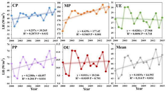 Latent heat flux (LH) trend of different land use types in the Huang-Huai-Hai River Basin from 2000 to 2015.