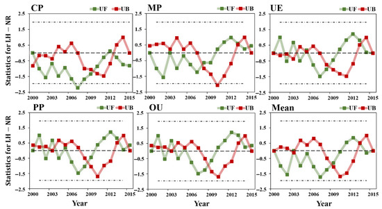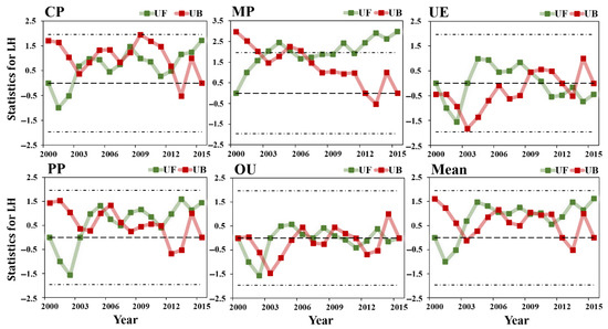 The trend of LH in various land use types in Huang-Huai-Hai River Basin from 2000 to 2015 as shown in Figure 10, with a multi-year average of LH was 66.2 and a multi-year LH trend of 0.18 . The LH trend of OU and UE were smaller than 0.1 , while the LH trend of CP, PP and MP were greater than 0.1 . An overall upward trend in the UF curve over a 16-year period as shown in Figure 11, and the UF and UB of MP intersected in 2005 outside the confidence line , indicating that significant mutations began in 2005, and the LH value of the MP region had been increasing continuously since then. The UE mutation trend characteristics differ from the annual average LH, with the mutation appearing in 2009 and showing a decreasing trend, which was related to the increase in impermeable area. In general, the LH values of OU and UE, which were more affected by human intervention, were always smaller than that of other land use types, and the LH values decreases with the increase of human activities influence on the surface, indicating that human activity has a negative impact on the value and trend of LH.