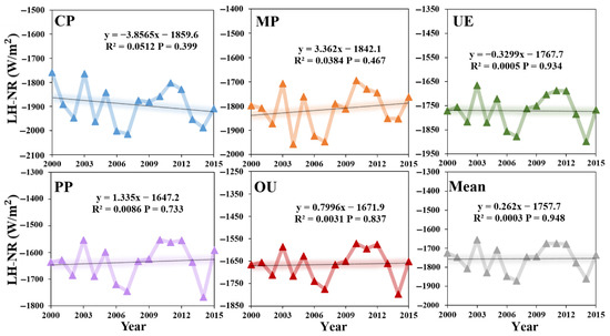 - From 2000 to 2015, the change trend of LH in five land use types was: MP > PP > CP > UE > OU. The NR values of UE and OU areas, which were greatly affected by human activities, were always lower than those of other land use types, and the NR values of CP and MP areas were much higher than those of UE, OU and PP areas. The NR values were generally on the rise, which was in line with the climate background of global warming.