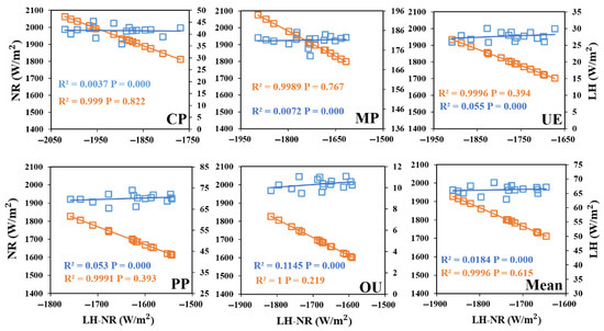 To further clarify the effect of LH or NR on , we compared the relationships between three energy factors. During the study period, the correlation between NR and in the five land use types was greater than that of LH and (Figure 15). and NR were consistent in MP, CP, UE, PP, and OU regions, while and LH were more relevant in OU and PP regions, followed by UE, MP, and CP regions.