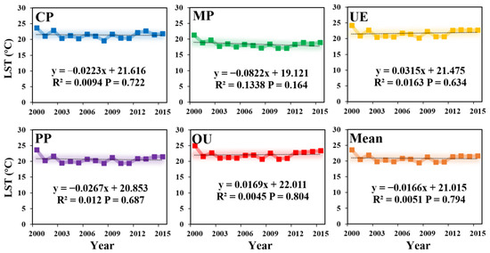 The trend in land surface temperature (LST) of different land use types in the Huang-Huai-Hai River Basin from 2000 to 2015.