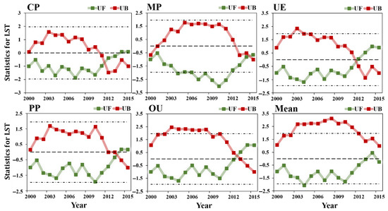 spatial distribution was different from LH, as can be seen from Figure 12 that the value was all negative. The high value area was mainly located in the north, the multi-year average of was −1755.5 , and the five land use types of multi-year average from high to low order were: PP > OU > UE > MP > CP. As shown in Figure 13, the values of the five land-use types showed an upward trend in 2000–2015, with a multi-year trend value of 0.26 for in 2000–2015. Figure 14 showed that the values of in the CP region had been on a brief upward trend since the mutation occurred in 2009, but the UF < 0 was on a decreasing trend, indicating that human activities have a stronger effect on regional warming. Furthermore, the values of in CP and UE areas showed a decreasing trend, while under the influence of irrigation impervious water surface in urban areas increased, indicating that the feedback effect of land use change brought by human activities on regional warming was enhanced.