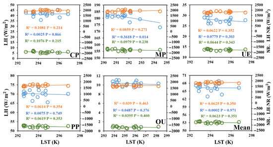 As shown in Figure 18, LST and were negatively correlated with NR in five land types. In general, the relationship between LST and was closer, followed by NR and LH, but this relationship did not pass the significance test (p = 0.1). It is worth noting that in the CP, OU and UE regions, the relationship between LST and NR was more significant, indicating that in areas where human activities are dense, the regulatory effect on LST of NR was more pronounced, whereas in the area of natural cropland interoperability, such as MP, the relationship was relatively weak.