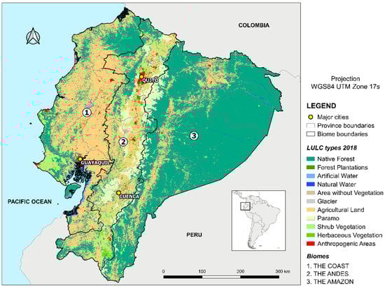 Continental Ecuador with major cities, land use and land cover (LULC) types from 2018 and the main biomes. Anthropogenic areas include settlements and infrastructure.