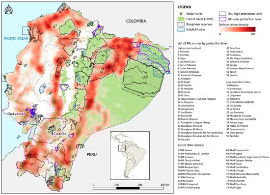 Hotspots of deforestation in continental Ecuador from 1990 to 2018. Protected areas (PAs) < 1 km2 are excluded due to resolution. The delineation is taken from MAATE (2021). The map shows the native forest area of the year 1990. Biosphere reserves (BRs) and Ramsar sites (RAMs) have been classified as areas with lower protection status. The PAs Bellavista (no. 3), Cordillera Oriental de Carchi (no. 10), Ichubamba Yasepan (no. 20), and Marcos Perez de Castilla (no. 37) were established just after 2018 and excluded in our analysis of landscape metrics but included in the map for completeness. IDAs = Internationally Designated Areas.