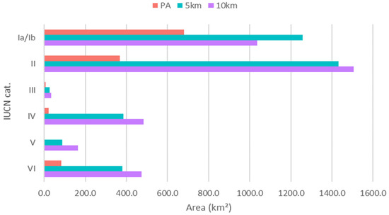Total accumulated deforested area in protected areas (of the national system of protected areas—SNAP) and buffer zones (5 and 10 km), between 1990 and 2018 in continental Ecuador. IUCN cat. = Protected area categories equivalent to the International Union for Conservation of Nature (IUCN).