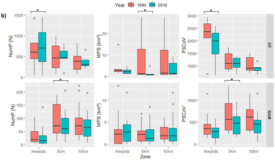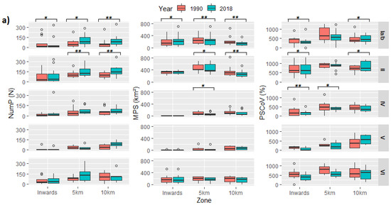 Boxplot of landscape metrics Number of Patches (NumP), Mean Patch Size (MPS), and Patch Size Coefficient of Variance (PSCoV) of: (a) IUCN protected areas categories (from top to bottom) Ia/b, II, IV, V, and VI as a function of their zones of protection; and (b) international designated areas Biosphere reserves (BR) and Ramsar sites (RAM). PAs of the category III were not considered as there is only one area within this class. Paired t-test significance level (symbol above the bar, * p ˃ 0.05, ** p ˃ 0.01) is provided only for paired variable with significant differences between years. Outliers were identified by interquartile range and the 5% marginal values of outliers were removed for better visualization. Figure A1 also shows the correlation between the number of patches and the mean patch size. Figure A2 presents the distribution of PSCOV and NumP.