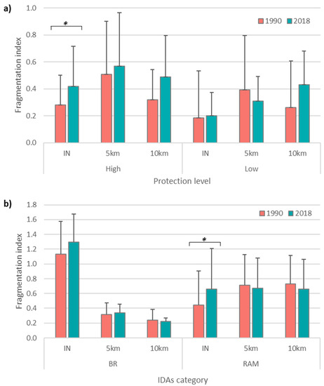 Comparison of average fragmentation index between 1990 and 2018 in terms of protection status (high and low) of: (a) Protected areas and protection zone (inwards protected area border, 5 km and 10 km buffer), and (b) international designated areas (IDAs) Biosphere reserves (BR) and Ramsar sites (RAM) with mixed protection status. Paired t-test significance level (symbol * above the bar, * p ˃ 0.05) is provided only for paired variable with significant differences between years.