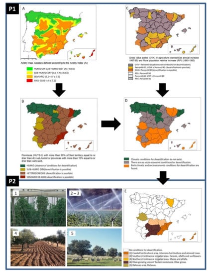 The method designed in SURMODES, outlined in Figure 1, consists of two procedures based both on climate and socio-economic risks. The first procedure (P1) produced a map of potential desertification, while the second (P2) used this map to identify socio-economic syndromes within provinces where desertification was developing. SURMODES works at the provincial level (i.e., small regions with populations between 150,000 and 800,000 inhabitants). Since several aridity zones can occur in each province (Figure 1A), only those with more than one half of their extension belonging to the dry sub-humid, semi-arid or arid classes were included (Figure 1B). The economic conditions risking desertification were then reflected through (i) the normalized annual increase in gross value added in agriculture for the period 1967–1995; and (ii) the relative annual increase in the rural population for the period 1965–1993 (Figure 1C). The intersection of climate and economic conditions yielded the potential desertification map (Figure 1D), where the provinces with both climatic and socio-economic conditions for desertification were identified. P2 looked at agricultural land uses that had undergone fast growth in the reference period (1967–1993). Data were obtained from the National Institute of Statistics (www.inebase.es (accessed on 10 January 2022). The expansion of cropland was used as a proxy variable of a potential threat of land degradation [20,21,22]. The provinces where the increase in surface was due to only one or two land uses, which also were consumers of limited resources in drylands (water, soil, fodder, etc.), were prime candidates for active desertification. The territorial expression of such dynamics converged to five desertification syndromes: (i) coastal irrigated agriculture; (ii) southern continental irrigated agriculture; (iii) northern irrigated agriculture; (iv) olive orchards in eastern Andalusia; and (v) dehesas, a savannah-like formation of permanent grasslands with disperse holm oak cover in the west of mainland Spain (Figure 1E). Additional information obtained from technical and governmental documentation, and from field surveys, which included mainly on-spot interviews with farmers and technical experts, was used to confirm the hotspots detected by SURMODES.