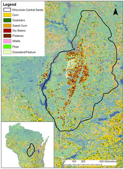 In the U.S., one of the leading potato and vegetable (e.g., green peas, sweet corn, snap beans, carrots) production regions is found in the Midwest across central Wisconsin on sandy soils [5]. The Wisconsin Central Sands (WCS) is a region located east of the Wisconsin River and is characterized by its deposits of sand and gravel, often >30 m thick above sandstone and crystalline bedrock [6,7] (Figure 1). The highly permeable sand and gravel layer contains a regional aquifer that sits at a typical depth of 3 to 20 m below the surface [6,8]. Typical recommended management of potato and vegetable crops in this region includes significant nitrogen (N) inputs from inorganic fertilizer (e.g., 145–250 kg N/ha; [1]), and approximately 100–380 mm of supplemental irrigation water (average of 274 mm from 2008 to 2012 for potato [9]) from late May through early September during the growing season, which is dependent on the seasonal weather [9]. Additionally, because of the high value of potato and vegetable crops and significant weed and pest pressure, a diverse crop rotation is also recommended for the WCS region [4,10].