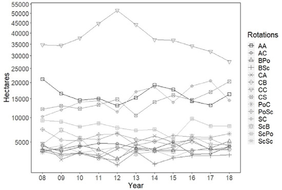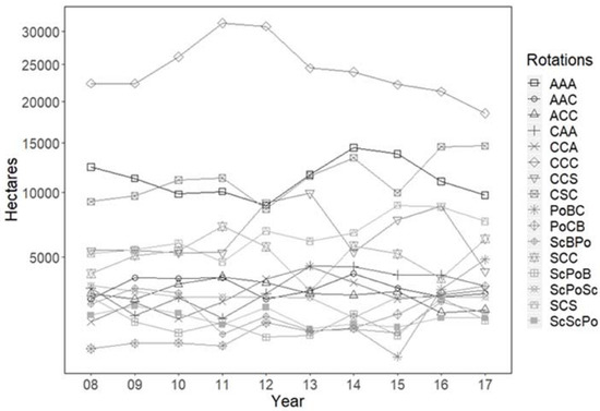 Dominant three-year rotations and their respective area totals for each year from 2008 to 2017. Total hectares on the Y axis are expressed with log scale. The following abbreviations correspond to the crop grown; C = corn, A = alfalfa, S = soybean, Sc = sweet corn, Po = potato, B = beans.