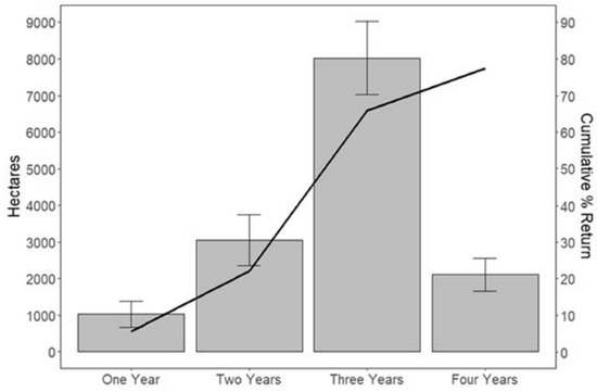 The analysis of multiyear rotations that began and ended with potato show that on average 5.6% (1025 ha) of potato returned to potato immediately, 16.6% (3050 ha) returned the second year after initial planting, 43.7% (8072 ha) returned in the third year, and 11.6% (2109 ha) returned after four years (Figure 5). This suggests that the most popular year in a potato rotation to come back to potato is year three (two years after the initial planting). A total of 64.8% and 77.4% of fields planted with potato have returned to that crop by the fourth and fifth years in the rotation, respectively (three- and four-year gaps, respectively) (Figure 5). The most common crops that are rotated with potato include sweet corn, corn, and beans. Sweet corn most commonly is grown between potato plantings, accounting for 47.5% of all two-year rotations, followed by corn (17.5%), and beans (15.8%) (Table 5). Rotations with two years of sweet corn grown in between potato crops account for 12.7% of all three-year rotations, and combinations of beans and sweet corn comprise 21.5% (Table 5). The cropping sequences that are most frequently found in four-year potato rotations include sweet corn–beans–sweet corn (16.2%), beans–sweet corn–beans (7.0%), and corn–corn–beans (6.0%) (Table 5). Only one potato rotation (potato–corn–beans–potato) exhibited a significant trend (increasing area; p = 0.047) over the study period (Table 5).