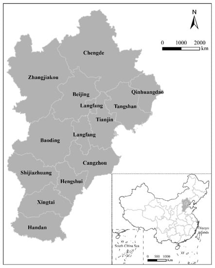 The study area (113°04′–119°53′ E, 36°05′–42°37′ N) includes Beijing, Tianjin, and Hebei province (Baoding, Langfang, Chengde, Shijiazhuang, Cangzhou, Xingtai, Qinhuangdao, Hengshui, Tangshan, Handan, and Zhangjiakou), which consists of 13 cities (Figure 1). This area covers an area of 218,000 km2 belonging to temperate semi-humid and semi-arid continental monsoon climates. The landform is diverse, mainly plain, and there are also mountains, hills, and basins, with an average elevation of about 200–500 m. Benefiting from topographical conditions, the BTH region is rich in land use types, among which farmland and forestland account for a large proportion. As China’s capital economic circle and third economic growth pole, the implementation of BTH’s coordinated development strategy in 2014 (one of the current three national strategies) has caused its population to grow rapidly with the population increasing from 90.39 million in 2000 to 110 million in 2020. In addition, the development trend has been rapid, with the GDP rising from 920.71 billion yuan to 8639.32 billion yuan, and the urbanization rate in core areas of Beijing and Tianjin reaching about 86.6% and 82.64%, respectively. However, with the acceleration of urban expansion, more and more green spaces have been converted into built-up areas, resulting in regional landscape changes and even destruction, posing challenges to the sustainable development of the BTH region [2,73].
