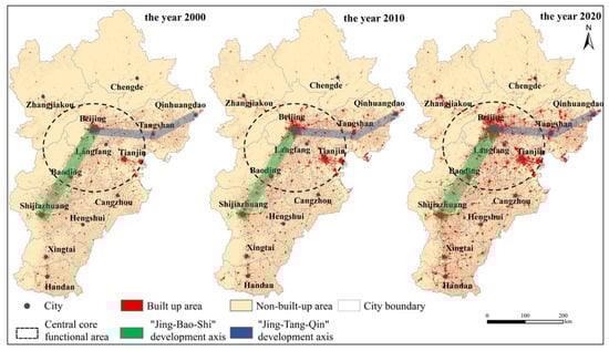 By analyzing the land use data of the BTH urban agglomeration from 2000 to 2020, we can see that in 2000, the scale of built-up areas was 14,931.96 km2, and by 2010, it increased to 17,898.76 km2 with an annual growth rate of about 1.99%. From 2010 to 2020, the urban expansion accelerated, and the area increased by 8630.61 km2 to 26,529.37 km2 with an annual growth rate of 4.82%; the area was 1.78 times that of 2000. The scale of built-up areas in the study area has been expanding continuously since 2000, and the expansion speed has accelerated in the past decade.