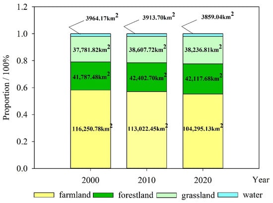 In terms of green space, the results are shown in Figure 3. In 2000, the total area of green space in BTH city circle was 199,808.23 km2, accounting for 92.49% of the total area. Among them, farmland was the main part, with an area of 11,6250.78 km2, accounting for 58.19%; forest land was 41,787.48 km2, grassland was 37,781.82 km2, and water was 3964.17 km2, accounting for 20.92%, 18.91%, and 1.98% respectively. The spatial autocorrelation of land indicates that while built-up areas are increasing, other types of land use are decreasing. In 2010, the total area of green space decreased by 1861.66 km2; from 2010 to 2020, the area of green space rapidly decreased by 9361.74 km2 to 188,584.84 km2, and a total of 13,353.52 km2 of green space was converted into artificial land. Among them, the farmland area dropped significantly from 11,955.65 km2 to 104,295.13 km2. Besides, the grassland scale increased slightly from 2000 to 2010, but it has also decreased in the last 10 years, reaching 38,236.81 km2 in 2020, with a cumulative decrease of about 454.99 km2. Forestland decreased during the past 10 years, but the overall area increased slightly, with an area of 42,117.68 km2 in 2020. As for water, due to the limitation of research scale, only 105.13 km2 of water reduction was observed, and the current scale is 3859.04 km2. The proportion of these three land use types in green space remains mainly unchanged. According to the land use transfer matrix (Table 3), we can conclude that the expansion of built-up areas mainly shifted from farmland and grassland, with 11,863.57 km2 and 947.58 km2 respectively, and other land use types also shifted out and transformed into each other to different degrees. To sum up, farmland is most affected by urban expansion, followed by grassland. Urban expansion has little impact on forestland and water.
