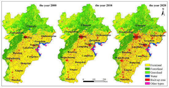 As can be seen in Figure 7, built-up areas continuously encroach on farmland, forestland, grassland, and other types of land around towns, but the encroachment on farmland is relatively slow and that on grassland is intensified. Generally, there are two major characteristics: The “extended” expansion centered on Beijing is remarkable, and the fragmentation of green space in Beijing urban area is intensified; the band expansion mode along the traffic trunk line is more prominent and the built-up areas are concentrated along the development axis of “Beijing–Baoding–Shijiazhuang”, but it is relatively less driven to other regions. The built-up areas in Beijing, Tianjin, and Hebei have expanded significantly, and the fragmentation of farmland has obviously intensified.