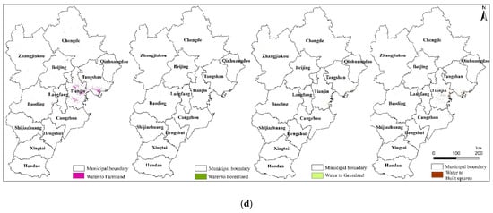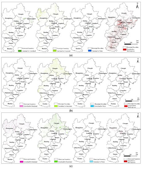 Figure 4 and Figure 5 show the distribution of green space and the specific transfer situation in BTH from 2000 to 2020 respectively. From the perspective of spatial distribution (Figure 4), farmland is distributed in the southeastern plain. Built-up areas expand outward continuously, leading to the continuous encroachment of farmland. The overall distribution of forestland in the BTH region is in an “inverted-J” shape, mainly concentrated in the Huairou and Yanqing districts of Beijing and the northeast and southwest of Hebei province. Grassland is mainly distributed around forestland. Because the terrain of forest and grassland distribution area is mainly mountainous, it is relatively less affected by the expansion of urban agglomeration, and the occupation is mainly near the city and the developed areas of Zhangjiakou and Chengde. Large-scale water bodies are mainly distributed along the coast of the Bohai Sea, as well as reservoirs, rivers, and lakes scattered in some cities. Due to the demand for water supply in the BTH region, they are less affected, mainly represented by the erosion of small tributaries.