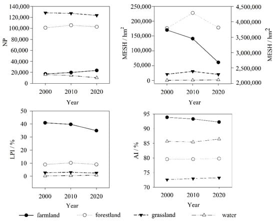 Class metrics can represent the structural characteristics and spatial distribution of different landscape types, thus making it possible to analyze a single landscape type. Figure 6 shows the trend of landscape metrics. In terms of NP, farmland, as the main landscape type in the study area, has been continuously increased for 20 years, eventually increasing by about 37%. In addition, its area has continuously decreased by 10.3%, indicating that its scale and integrity have been destroyed. The NP of forestland showed an upward trend in 2000–2010 and a downward trend in 2010–2020, which was consistent with the change in its area. The scale of grassland is not dominant, but the number of patches is always the highest, indicating that the distribution is scattered. Its NP showed a downward trend, while its area showed a trend of first increasing and then decreasing, and the decreasing trend of the number of patches in the last decade was obviously higher than the decreasing rate of the area. To some extent, it showed that the increase in grassland area was mostly based on the expansion of primitive grassland, while its decrease was mostly seen in the disappearance of small patches. However, the water area has been decreasing continuously in the last 20 years, and the number of patches has also decreased, indicating that small tributaries or small patches in water areas have been cut off, dried up, or converted into other land use. The trends of LPI and MESH for different land types are similar. Specifically, the LPI of farmland decreased from 40.92% to 34.94%, and MESH decreased by 28.1%; LPI and MESH of forestland first increased and then decreased; grassland also increased first and then decreased, and the indexes were lower than those in 2000; LPI and MESH continue to decline in water. In terms of AI, the farmland decreased obviously, forestland and grassland remained stable, and the water first decreased and then increased. The changes of these indicators all show that patches of farmland are constantly being cut, their shapes tend to be complex, and their fragmentation is intensified to some extent. A decade ago, due to population reproduction and afforestation projects, forestland was gradually distributed contiguously. However, in the last decade, this weakened somewhat, falling back to a situation similar to that of 2000, and the fragmentation degree is now relatively stable. It can be seen that the impact of urban agglomeration expansion on forestland is limited, which may be due to the following reasons: Firstly, most of the forestland is distributed in mountainous areas, and because of the influence of terrain, the cost is relatively high, and it is unlikely to face interference and be changed by humans; secondly, at the beginning of the 21st century, serious forestland degradation caused Beijing to be frequently attacked by natural disasters such as sandstorms, which enhanced the government’s awareness of forest management and ecological barrier construction. In addition, urban events such as the 2008 Olympic Games caused the government and citizens to pay attention to environmental quality, which made afforestation and forestland protection an important task. In the first decade, the area of grassland increased and patches tended to be complete, but in the last decade, due to the acceleration of urban expansion, the grassland was damaged and the degree of fragmentation was intensified. During the research period, water was also found to be damaged and fragmented, which may have been caused by the impact of urban expansion or severe exploitation, and the implementation of the “water to drought” project in some regional water systems such as the Chaobai River Basin in 2006.