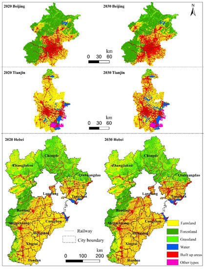 In terms of fragmentation of green space, it can be seen from Table 6 that compared with 2020, the AI of farmland will decrease in 2030, and so its agglomeration will be further weakened. While the area is further reduced, its NP increases and MESH and LPI decrease, indicating that its large patches may continue to separate into small patches and landscape fragmentation would be further aggravated. The size of grassland and water also decrease slightly, and NP increases while AI decreases, so their fragmentation may be increased. However, as for forestland, its NP decreases while the MESH, AI and LPI increase, so its landscape may connect with each other and fragmentation may decrease. Overall, in 2030, the scale of green space in BTH urban agglomeration will be further reduced, and the fragmentation of farmland, grassland, and water will be further aggravated. Although the scale of forestland will be reduced slightly, its fragmentation will still be lower.