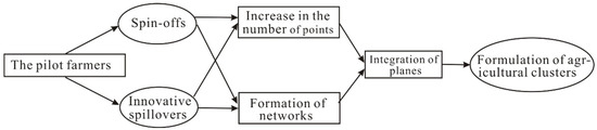 - The formation of the agricultural cluster was the result of joint effects of spin-off derived from the entrepreneurial spirit of the farmers, network-spillover of different agricultural innovations, and spatial integration of the agricultural landscape. This can be illustrated as pilot farmers with entrepreneurial spirits introduced or pursued innovative knowledge (knowledge production or introduction) → innovation spillover (knowledge diffusion) → derivation (adopted knowledge) → new subject entrepreneurship → industrial agglomeration → secondary innovation (complementary knowledge, reproduction and recreation) → derivation again (knowledge adopted again) → agricultural cluster formation → acceleration of agricultural innovation system perfection and industrial spatial integration. The formation of local agricultural innovation system marks the maturity of agricultural clusters.