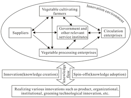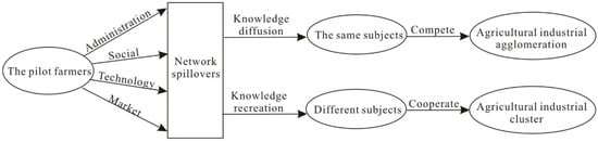 Innovation is the driving force of sustainable development of industrial cluster. However, innovation is a systematic engineering, and innovation of one link must be coordinated with other links in order to play an effective role. Therefore, the formation of local agricultural innovation system marks the maturity of industrial clusters. The agricultural innovation system is an agricultural organization and system arrangement composed of diversified innovation subjects, networked innovation process, regional innovation environment, and integrated innovation objectives. The pilot farmers with entrepreneurial spirit in a region, triggered by a certain opportunity, acquire new knowledge or new technology for the development of a new industry, adopt the new knowledge, and successfully establish a start-up enterprise, and their new knowledge flows quickly in the neighboring rural communities and is imitated and adopted. A large number of similar and supporting enterprises or supporting service institutions have been derived [19], which have formed an innovation network together with government departments, university, research institutions and intermediary institutions. The Government has put forward a series of policy arrangements to promote the development of local industries and improve local innovation environment. It can be seen that spin-off and innovation spillover promote the formation of local agricultural innovation system and realize local product innovation, organizational innovation, institutional innovation, technological innovation, and spatial restructuring (Figure 7).