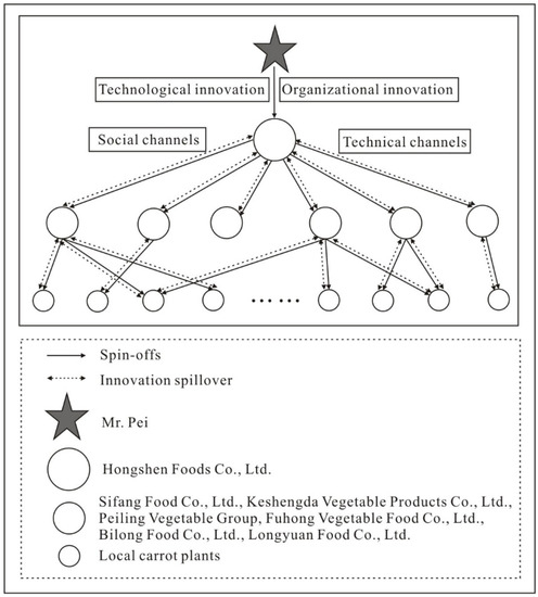 In this period, although the household contract responsibility system of China’s arable land greatly liberated the productivity of rural areas, most rural households were still self-sufficient in cultivating traditional food crops for food and clothing. At the end of the 1980s, advocated by the local government, some transformed from planting traditional food crops to vegetable cultivation. Such practices spilled their cultivating technology through such social relations channels as kinship, friendship, and relationships among farmers in the same area, resulting in similar plantations. In this way, they realized the clustering plantation of the vegetable industry. With the increase in the farmers’ capabilities, the pilot or pioneer farmers achieved organizational innovation and transformed into enterprises. On the one hand, spin-offs (or derivation) through social relations channels could reduce the risks of information acquisition and the difficulty of technology acquisition. On the other, financial support could be obtained through more intimate social relations.
