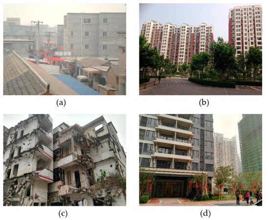 Urban village demolition and redevelopment to intensify and upgrade the urban land-uses (a,b): Tangjialing Urban Village pre- and post-redevelopment in Haidian, Beijing; (c,d): Xi’An Village pre- and post-redevelopment in Tianhe, Guangzhou; field trip by authors.