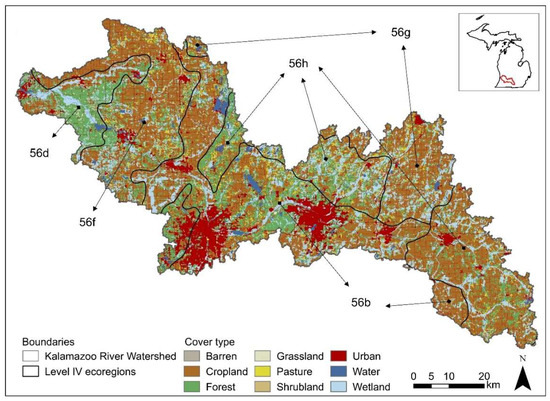 The Kalamazoo River Watershed (5621 km2; Figure 1) is located in southwest Michigan, USA, and includes portions of 10 counties: Allegan, Barry, Calhoun, Eaton, Hillsdale, Jackson, Kalamazoo, Kent, Ottawa, and Van Buren. The mean annual temperature (1981–2010) is 9.9 °C, and the average annual precipitation is 900 mm evenly distributed throughout the year [23]. The dominant cover type prior to European settlement in the early 1800 s was eastern broadleaf deciduous forest [24], with scattered patches of tallgrass prairie, oak savanna, lakes, and wetlands [25]. The dominant land cover includes cultivated crops, successional forest stands, pasture-hay grasslands, and two urban areas (i.e., Kalamazoo and Battle Creek). Medium to coarse texture soils and mesic climate allow the continuous recharge of groundwater [26].